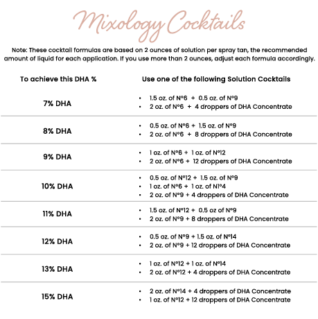 Think about it; if you are spraying your client with two coats of No 9 Solution (9% DHA), your client is not going to develop to an 18% tan! If your client wants to be darker, move up a solution level, add DHA Booster Drops or take advantage of Sjolie’s Mixology methods! *not a mixology expert yet? Click HERE to check out our Mixology Blog
