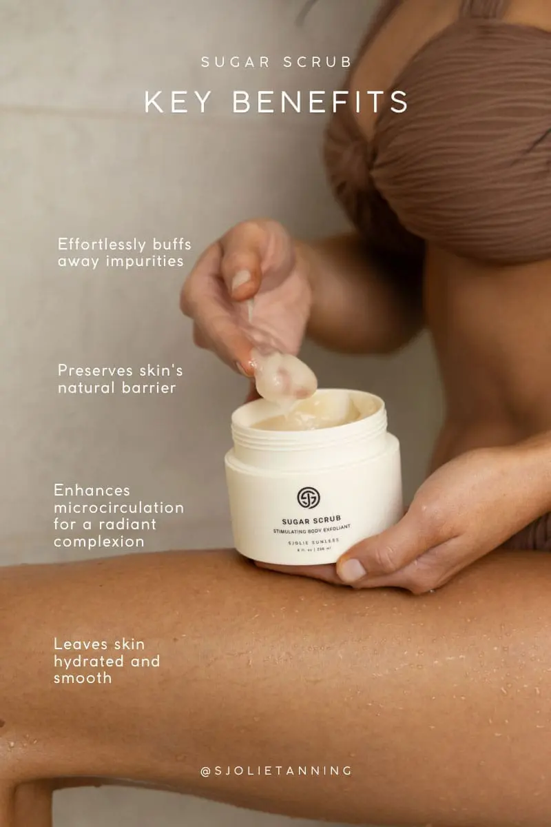 The best exfoliator is gentle and residue-free. You want a smooth, oil-free canvas so solution applies evenly. Sjolie Sugar Scrub is oil-free and fragrance-free, so it’s ideal for prep and old tan removal.